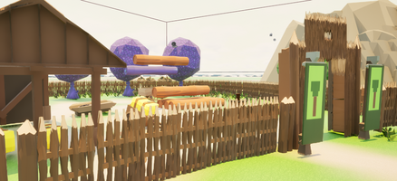 The first area built for Velgron was a simple lumberyard, surrounded by fences and filled with sawed logs, a work shed, and NPC props like wheelbarrows and tool storage. This area sets the tone for the skilling aspect of the game (woodcutting, crafting) and will connect into the larger economy of Velgron.
